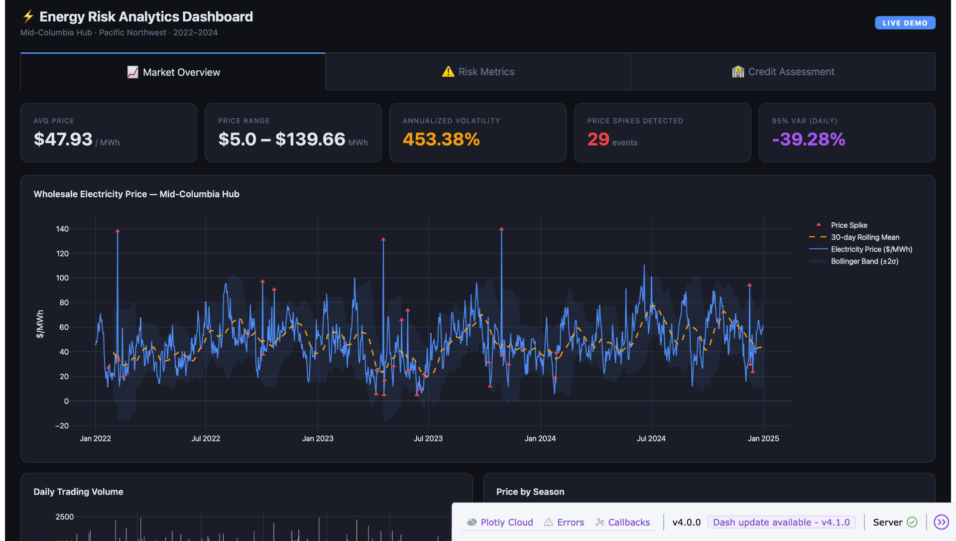 - Built an end-to-end electricity market risk analytics platform with a Python/Plotly Dash dashboard covering market analytics, VaR/CVaR risk metrics, price spike detection, and counterparty credit scoring across 15 counterparties (A/BBB/BB ratings).