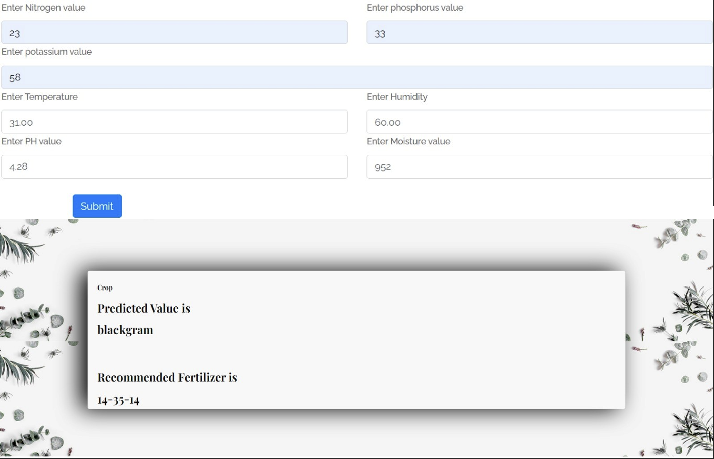 Crop & Fertilizer Prediction: The interface shows the ML model recommending 'blackgram' and '14-35-14' fertilizer based on soil NPK, pH, and environmental sensor data.