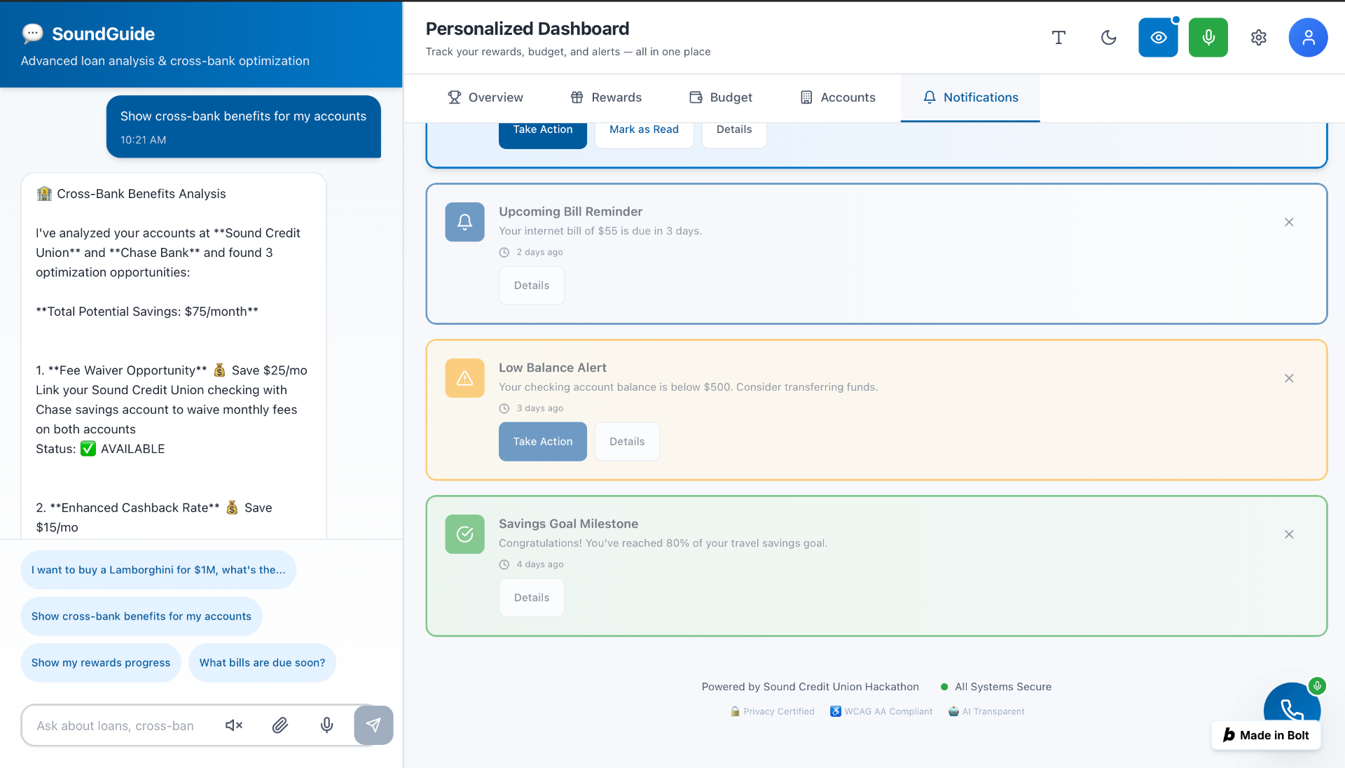 SoundGuide AI chatbot analyzing cross-bank benefits alongside proactive notifications. Bill reminders, low-balance alerts, and savings milestones.
